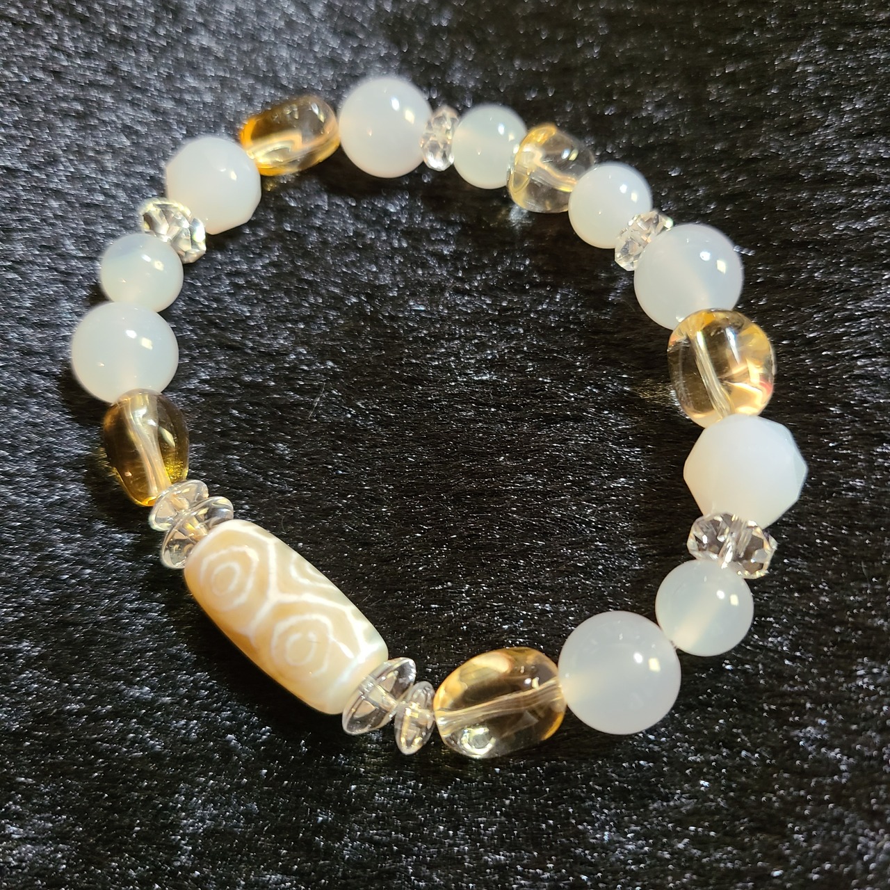 クリーム色の天然色瑪瑙に龍の眼の紋様を焼き付けた天珠ビーズを使用したブレスレットです。